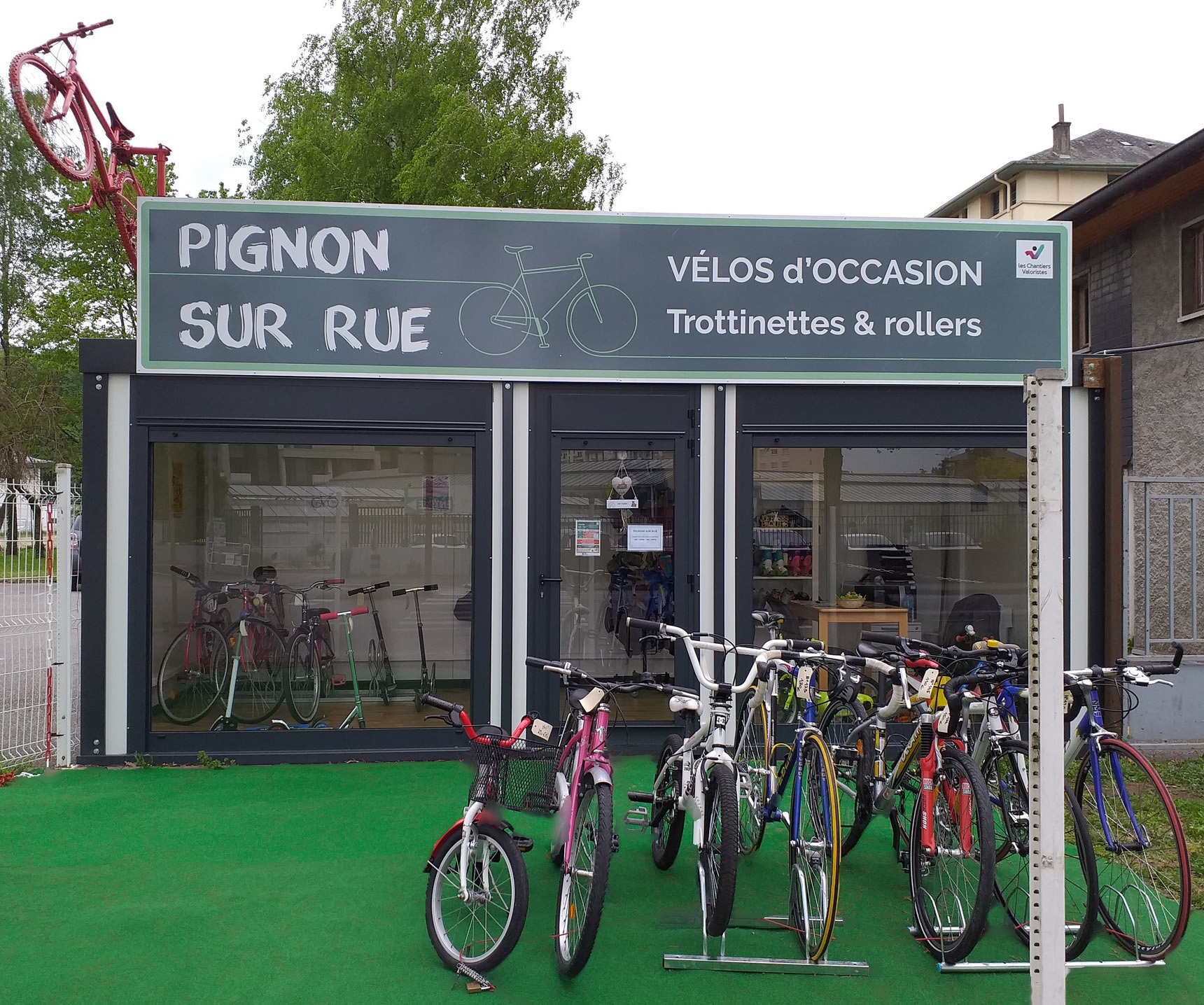 Pignon sur Rue est un magasin dédié à la mobilité durable, situé à Chambéry. On y trouve des vélos, trottinettes, rollers de seconde main, récupérés, réparés, nettoyés et remis en vente à prix accessibles.